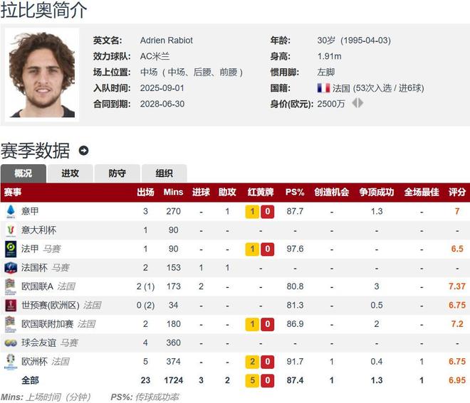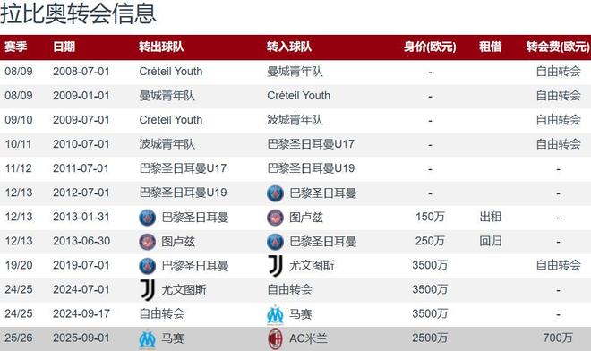 拉比奥特今年夏天与队友打架,被马赛低价甩卖,身价2500万欧元,转会费700万欧元就打骨折卖给了AC米兰。拉比奥特的年薪从税前630万欧元(马赛),暴涨50%左右,涨至税前920万欧元(AC米兰)。