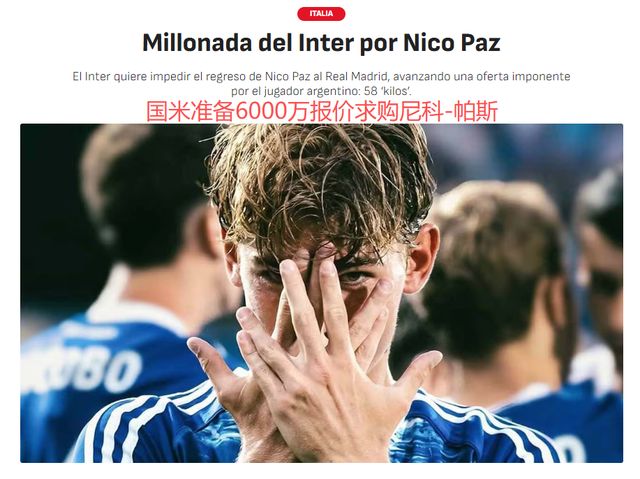 科莫希望买断尼科-帕斯,废除皇马的回购条款,让阿根廷小将长期留在球队。不过,皇马拒绝科莫的请求。阿根廷TyC体育称,意甲豪门国米愿意引进尼科-帕斯,出价6000万欧元。