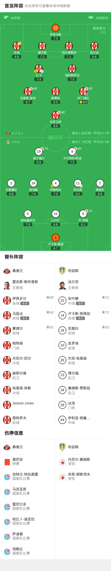 北京时间12月28日英格兰足球顶级联赛 联赛 第18轮,桑德兰主场对阵利兹联。上半场,扎卡助攻阿丁格拉破门。下半场,阿伦森助攻卡尔弗特-勒温扳平。最终比分桑德兰 1-1 战平利兹联。
