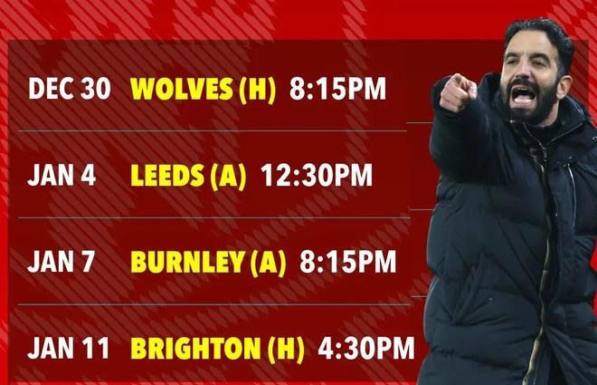 也就是说,接下来3场比赛,曼联的对手都排在积分榜最后5位,这是阿莫林豪取执教以来首次四连胜的最佳机会!如果算上足总杯第三轮主场对布莱顿(英超第13位)的比赛,在1月中旬迎战曼城的同城德比之前,球队有机会实现各项赛事五连胜,让球迷过个好年。